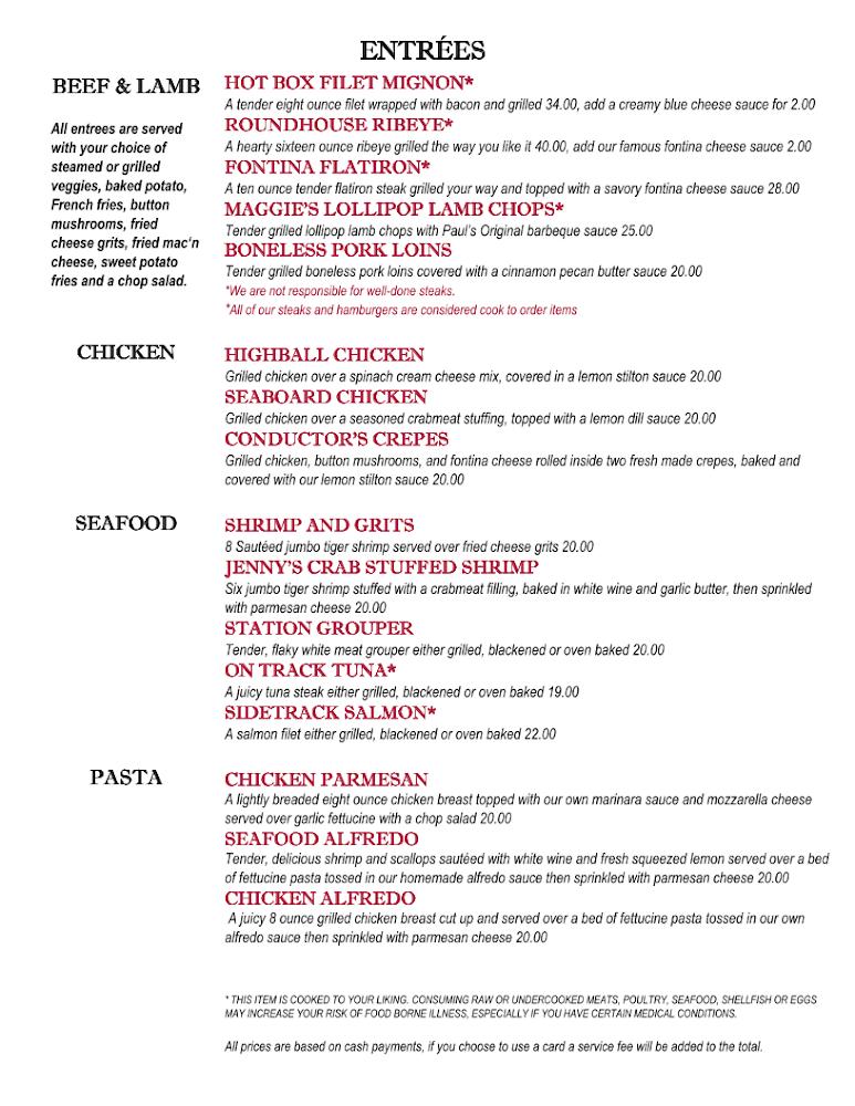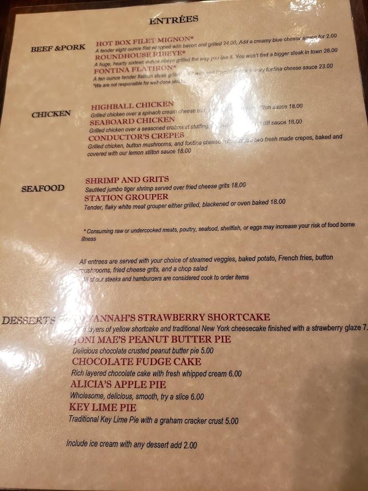 The Station features a diverse menu, reflecting American cuisine with a Southern twist. Signature items include the Roundhouse Ribeye, fresh seafood dishes, and hearty pasta selections. Each dish highlights the quality of locally sourced ingredients.